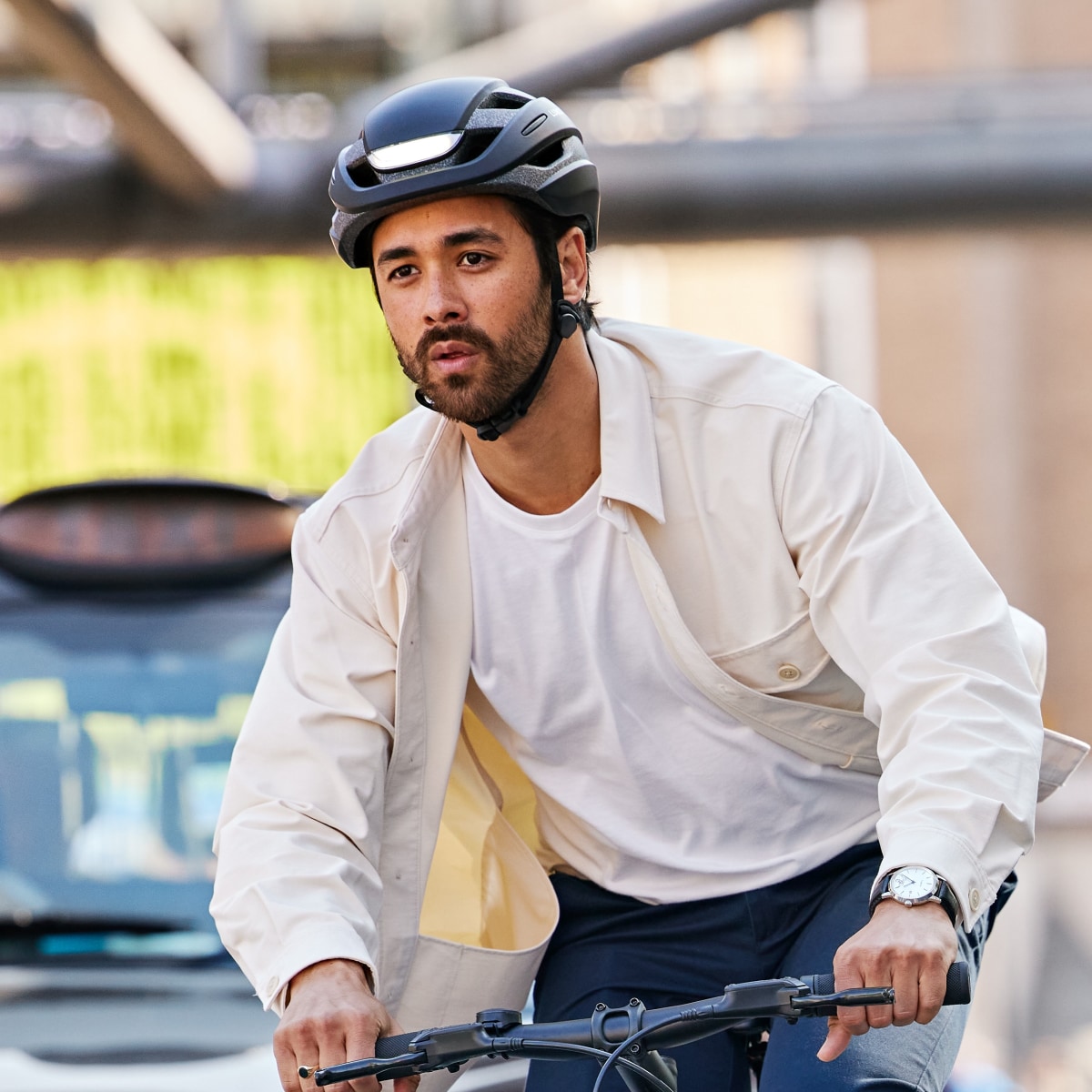 Der smarte Helm ist mit zahlreichen LED-Modulen ausgestattet, die eine Rundum-Abdeckung bieten und somit deine Erkennbarkeit deutlich verbessern. Außerdem verfügt der Radhelm über praktische Blinker, die du durch die mitgelieferte Fernbedienung oder deine Apple Watch aktivieren kannst. Dank seiner Kompatibilität mit Apple Watches, Apple Health und Strava ist dieser Helm nicht nur super stylish, sondern auch richtig smart und cool – ein idealer Begleiter bei deiner Fahrt durch den Großstadt-Dschungel oder einer Trekking-Tour.
