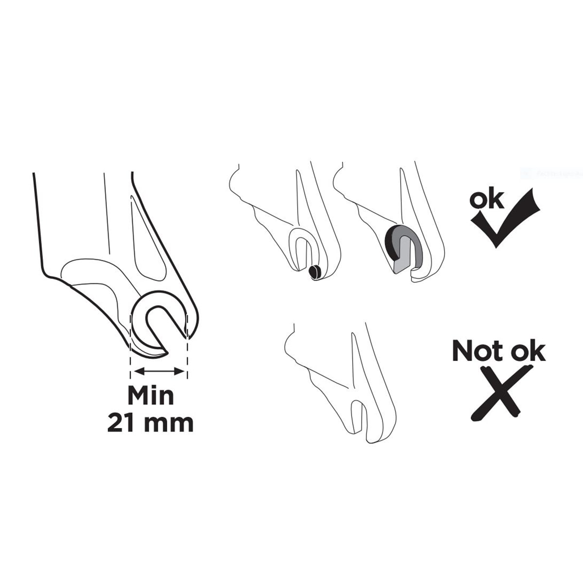 Aus Sicherheitsgründen weist Thule darauf hin, dass die Gabelmontage bei offenen Ausfallenden NUR dann freigegeben ist, wenn diese über gängige Sicherheitsführungen (sogenannte Lawyer Lips, siehe Abbildung) mit mindestens 21 mm Auflagefläche verfügen.
